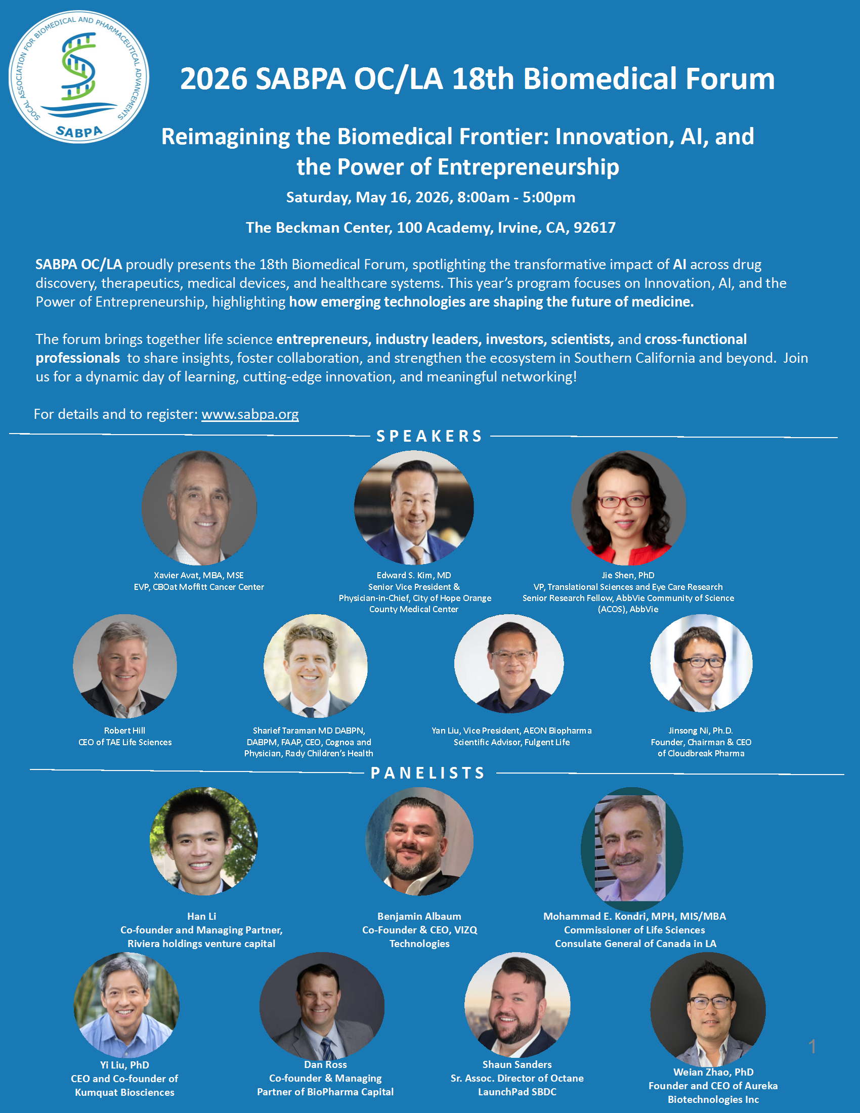 SABPA OC/LA proudly presents the 18th Biomedical Forum, spotlighting the transformative impact of artificial intelligence (AI) across drug discovery, advanced therapeutics, medical devices, and healthcare systems. This year’s program focuses on Innovation, AI, and the Power of Entrepreneurship, highlighting how emerging technologies are shaping the future of medicine and life sciences. The forum brings together life science entrepreneurs, industry leaders, investors, scientists, and cross-functional professionals to share insights, foster collaboration, and strengthen the biotechnology and life sciences ecosystem in Southern California and beyond. Join us for a dynamic day of learning, cutting-edge innovation, and meaningful networking!